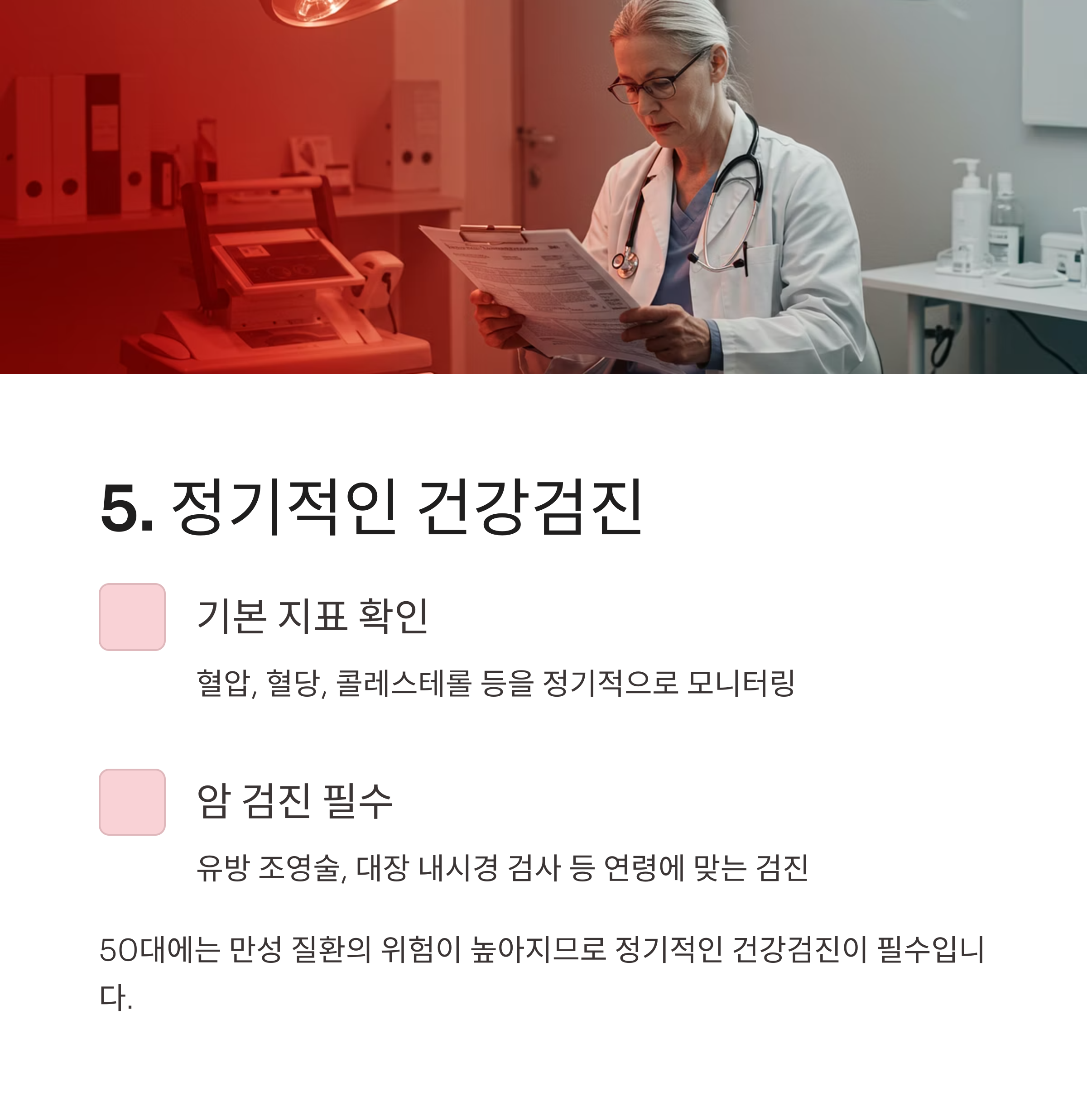 50대는 인생의 전환점입니다. 지금까지의 생활습관을 점검하고 건강한 노후를 준비할 수 있는 마지막 골든타임이기도 합니다.