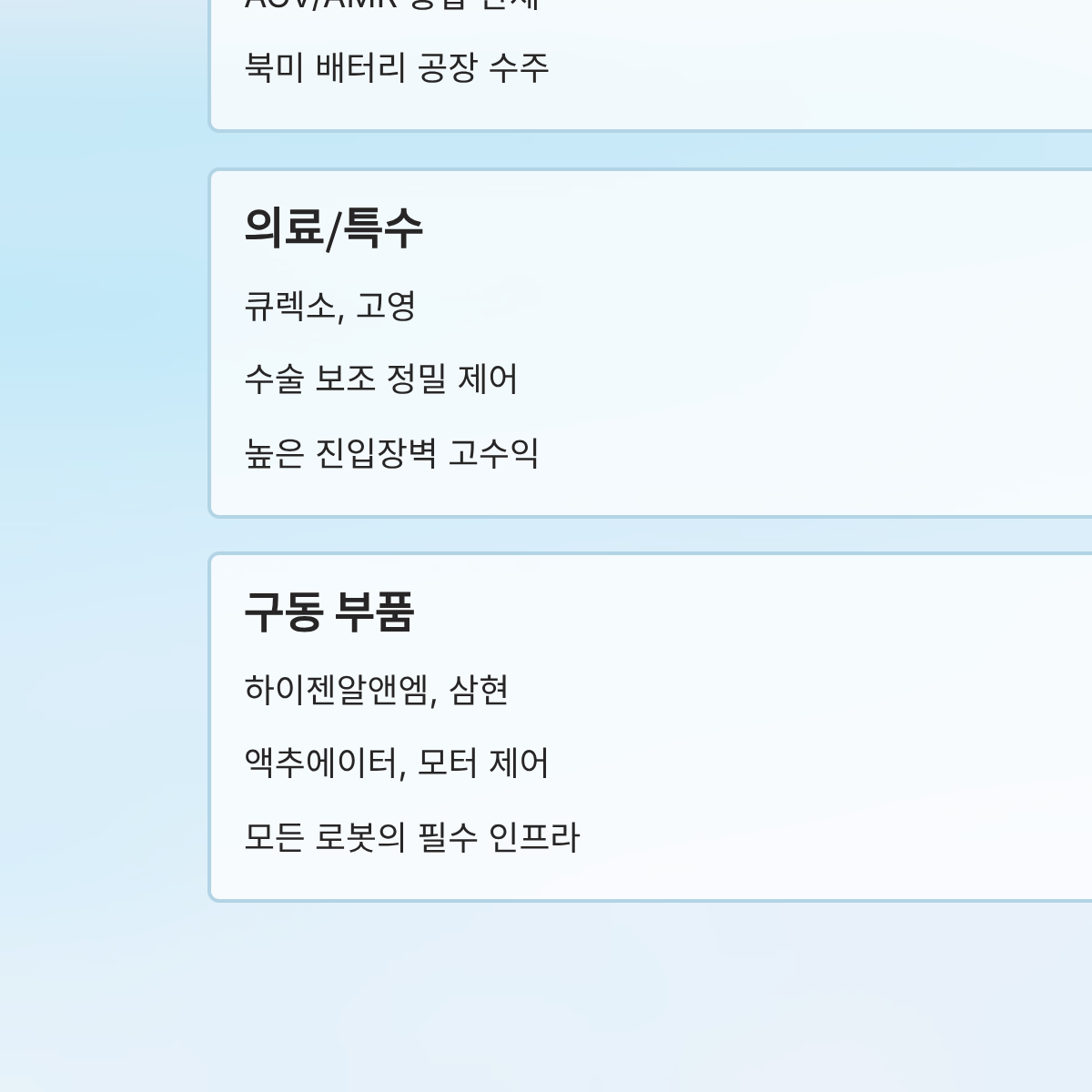 | 의료/특수 | 큐렉소, 고영 | 수술 보조 정밀 제어, 3D 검사 기술 | 높은 진입장벽의 '고수익주' |