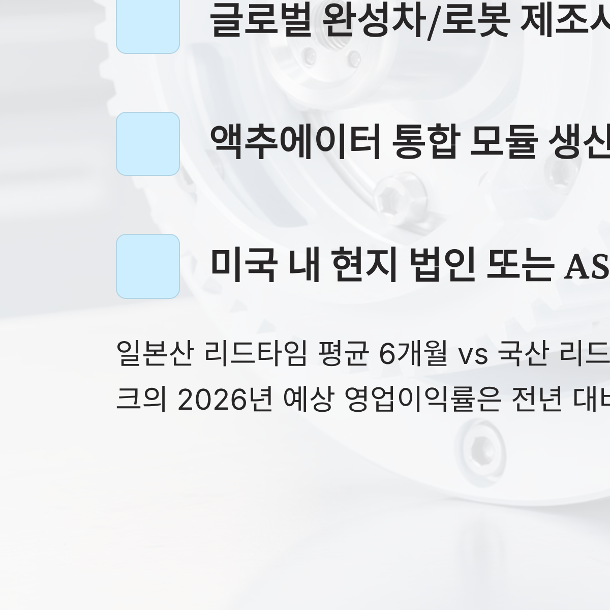 * 특히 감속기 분야는 일본의 독점을 깨고 국산화에 성공한 기업들이 내년 흑자 전환 가시권에 들어와 있습니다.