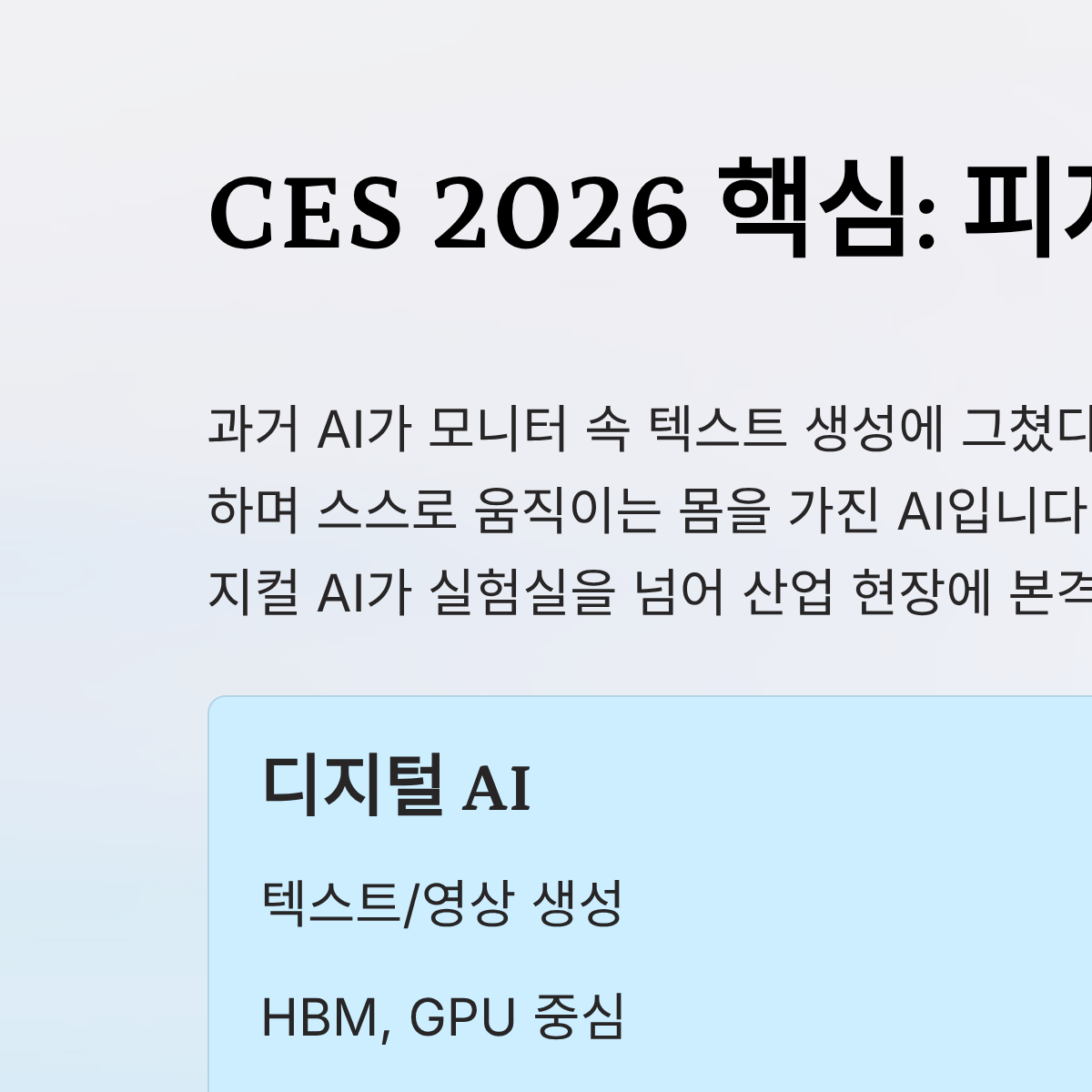 * 디지털 AI는 '두뇌'의 발달에 집중하지만, 피지컬 AI는 '신체'와의 결합이 필수적입니다.