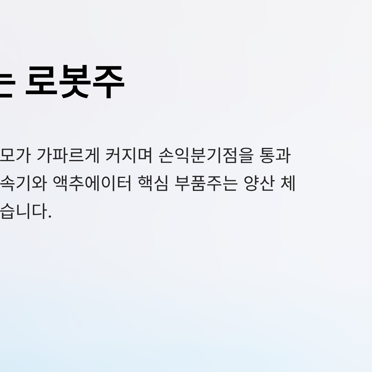A: 과거에는 매출 자체가 없는 기대감뿐이었다면, 현재는 매출 규모가 가파르게 커지며 손익분기점(BEP)을 통과하는 기업들이 속속 등장하고 있습니다. 특히 감속기나 액추에이터 같은 핵심 부품주는 양산 체제 돌입에 따른 흑자 전환 가시권에 들어와 있어, '성장하는 적자'에서 '이익을 내는 성장주'로 변모하는 구간입니다.