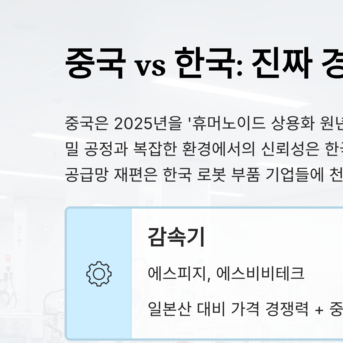A: 중국이 가격 경쟁력을 앞세우고 있지만, 미국 중심의 '탈중국' 공급망 재편으로 인해 국내 기업들의 정밀 감속기 및 제어 기술 수요가 급증하고 있습니다. 특히 고정밀 기술이 필요한 핵심 부품 분야에서 국산화에 성공한 기업들은 글로벌 공급망의 대체 불가능한 파트너로 성장할 가능성이 큽니다.