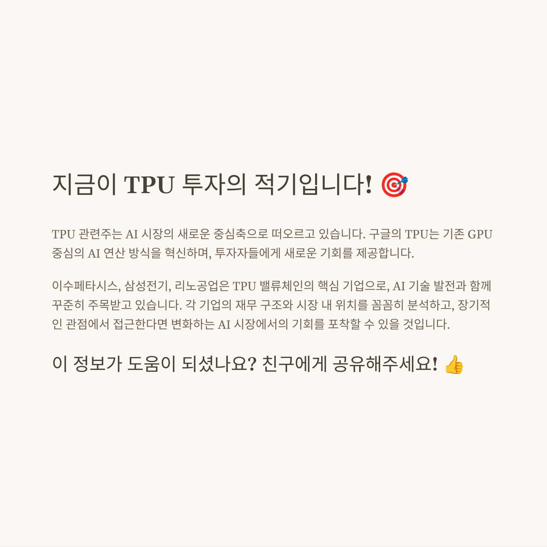 TPU 관련주는 AI 시장의 새로운 중심축으로 떠오르고 있습니다. 구글의 TPU는 기존 GPU 중심의 AI 연산 방식을 뒤흔들며, 투자자들에게 새로운 기회를 제공합니다. 특히 이수페타시스, 삼성전기, 리노공업 등은 TPU 밸류체인의 핵심 기업으로, 이들의 주가는 AI 기술 발전과 함께 꾸준히 주목받고 있습니다. 하지만 투자에는 항상 리스크가 따릅니다. 각 기업의 재무 구조와 시장 내 위치를 꼼꼼히 분석하고, 장기적인 관점에서 접근하는 것이 중요합니다. TPU 관련주는 단기적인 이슈에 민감할 수 있지만, AI와 데이터센터 증설이라는 장기 트렌드 속에서 지속적인 성장을 기대할 수 있습니다. 이러한 관점에서 투자 전략을 세운다면, 변화하는 AI 시장에서의 기회를 포착할 수 있을 것입니다.