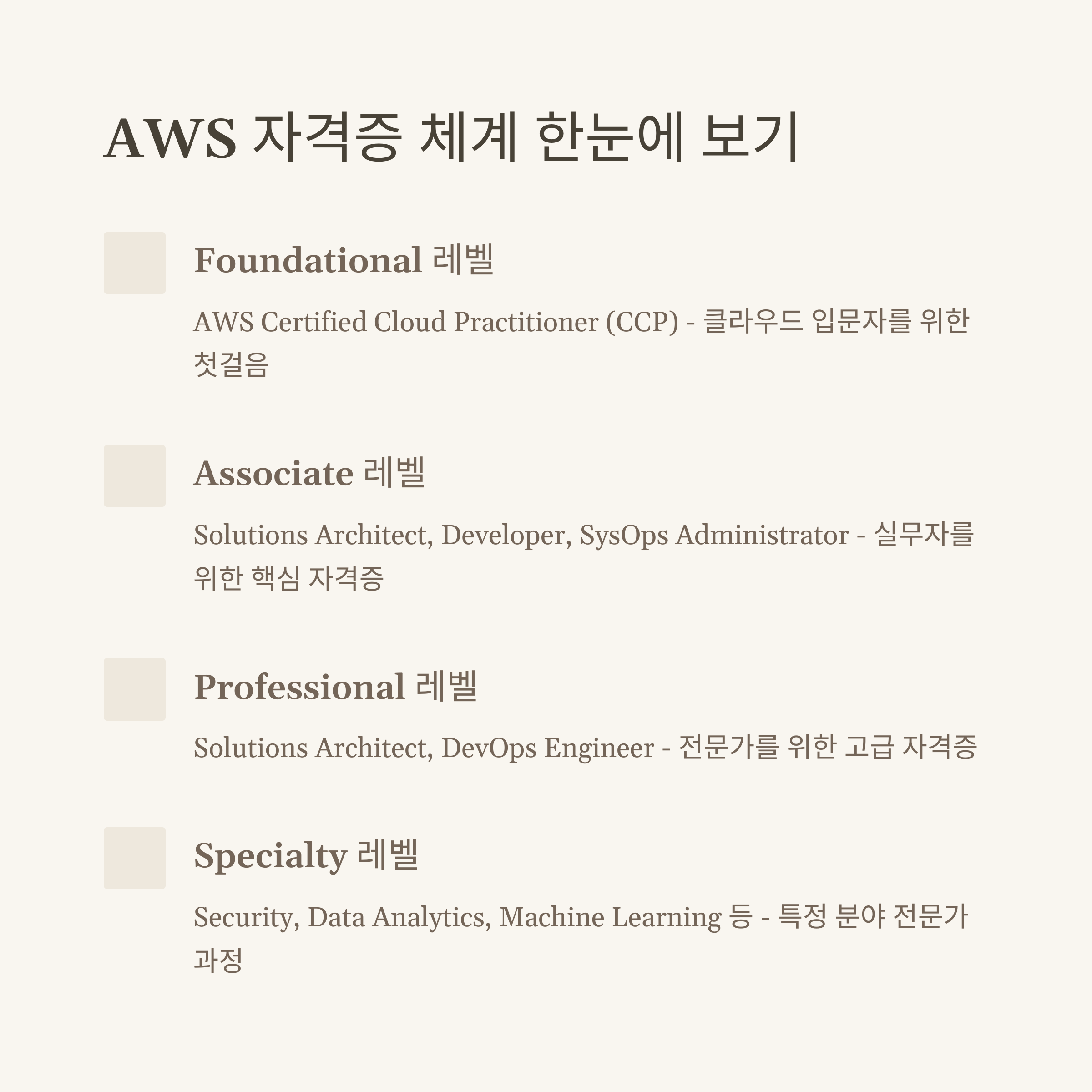 AWS 자격증은 크게 4단계 레벨로 나뉘어 있으며, 각 레벨별로 특성과 목적이 다릅니다: