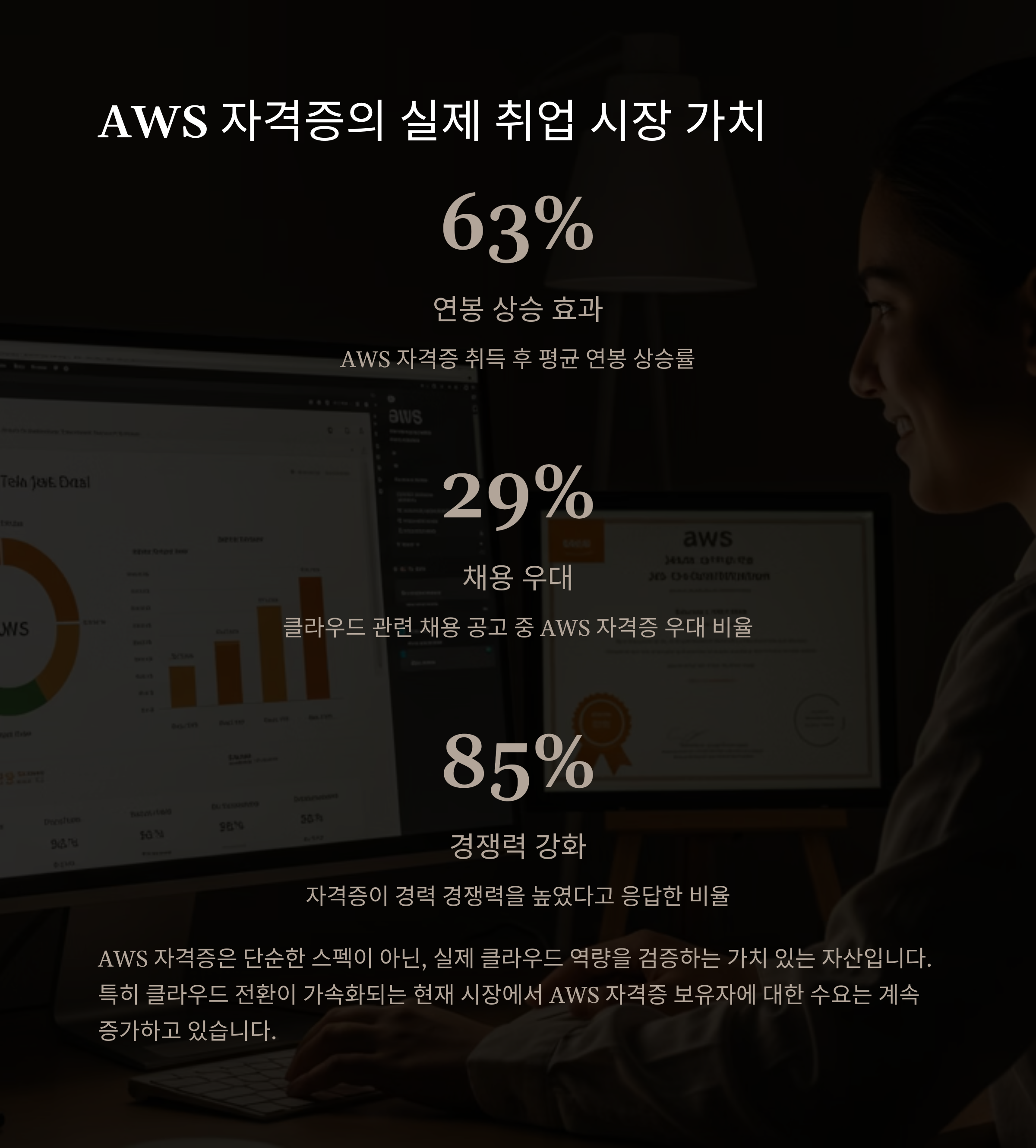 AWS 자격증은 단순한 스펙이 아닌, 실제 클라우드 역량을 검증하는 가치 있는 자산입니다. 클라우드 기술은 계속해서 IT 산업의 핵심으로 자리잡고 있으며, AWS는 이 분야의 선두주자로서 위치를 공고히 하고 있습니다.