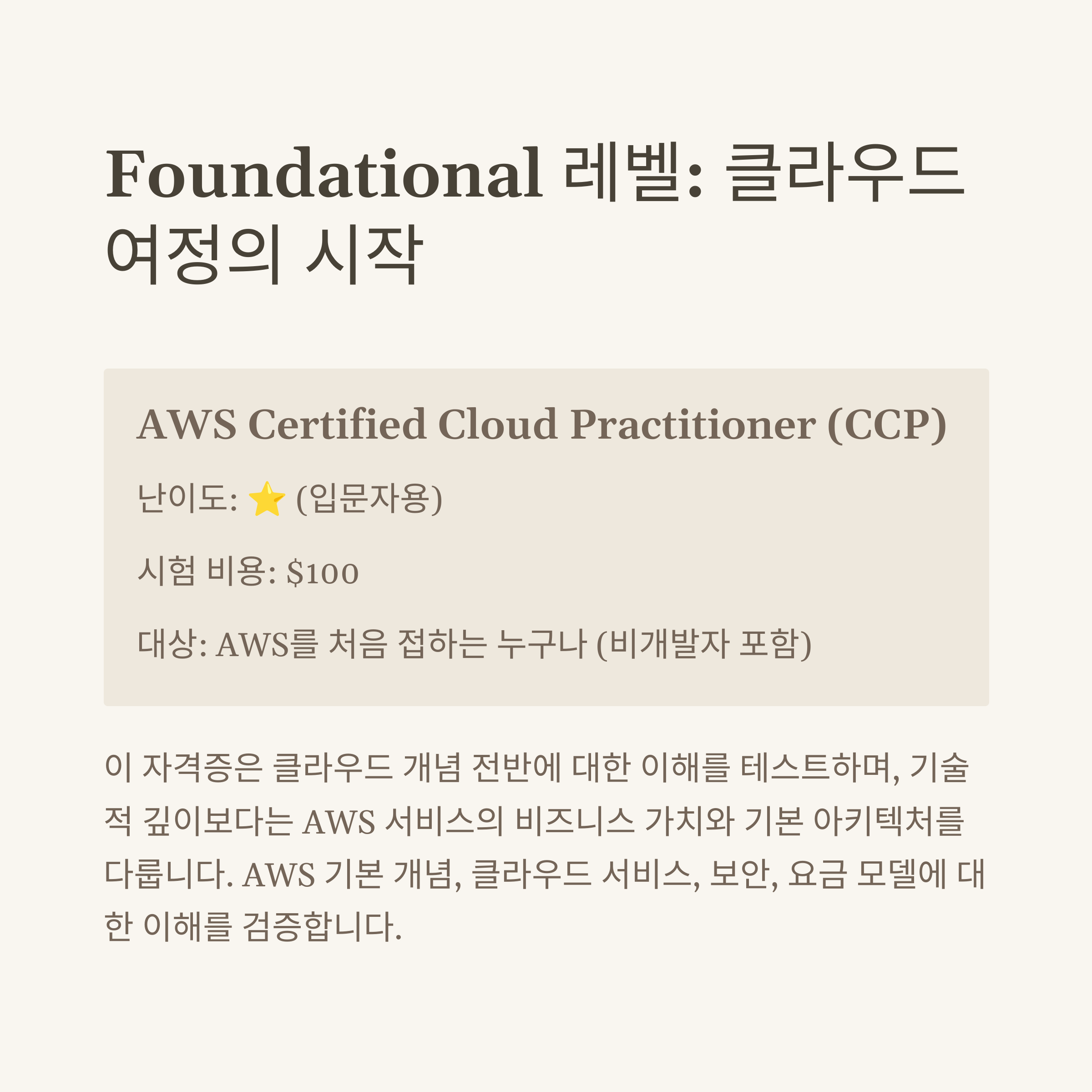이 자격증은 클라우드 개념 전반에 대한 이해를 테스트하며, 기술적 깊이보다는 AWS 서비스의 비즈니스 가치와 기본 아키텍처를 다룹니다.