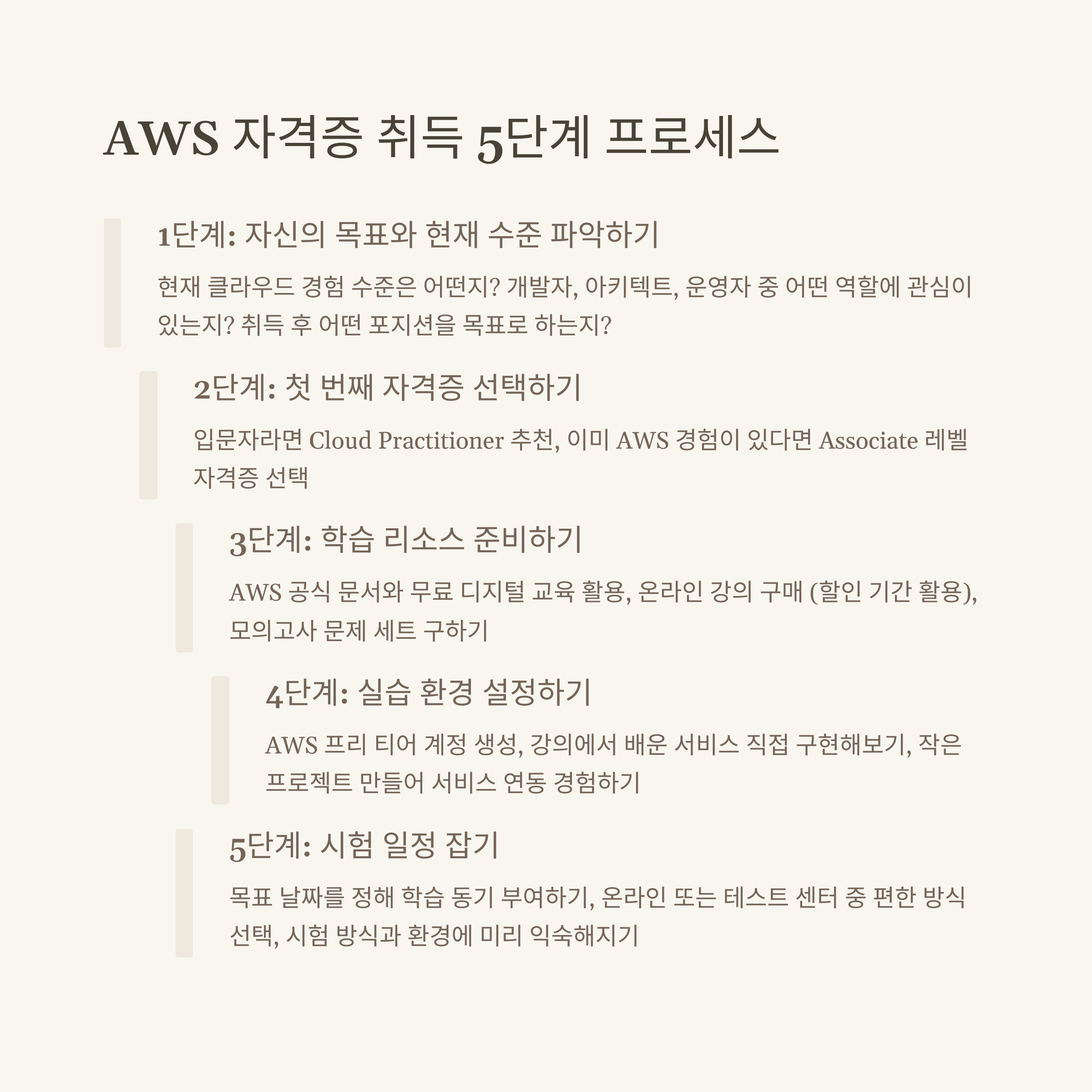 이제 AWS 자격증 취득을 위한 구체적인 단계를 살펴보겠습니다: