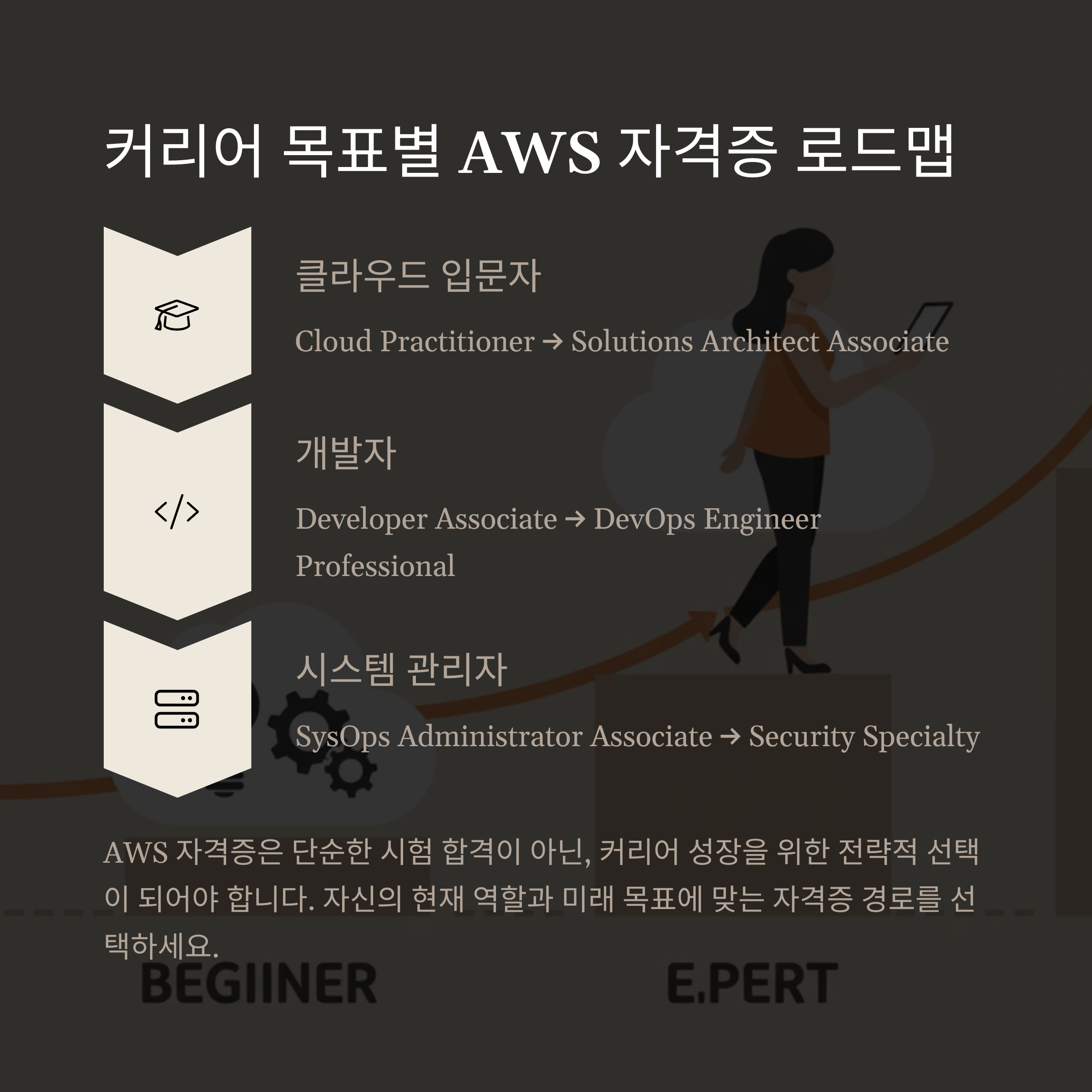 AWS 자격증은 단순한 시험 합격이 아닌, 커리어 성장을 위한 전략적 선택이 되어야 합니다. 다음은 목표별 추천 로드맵입니다: