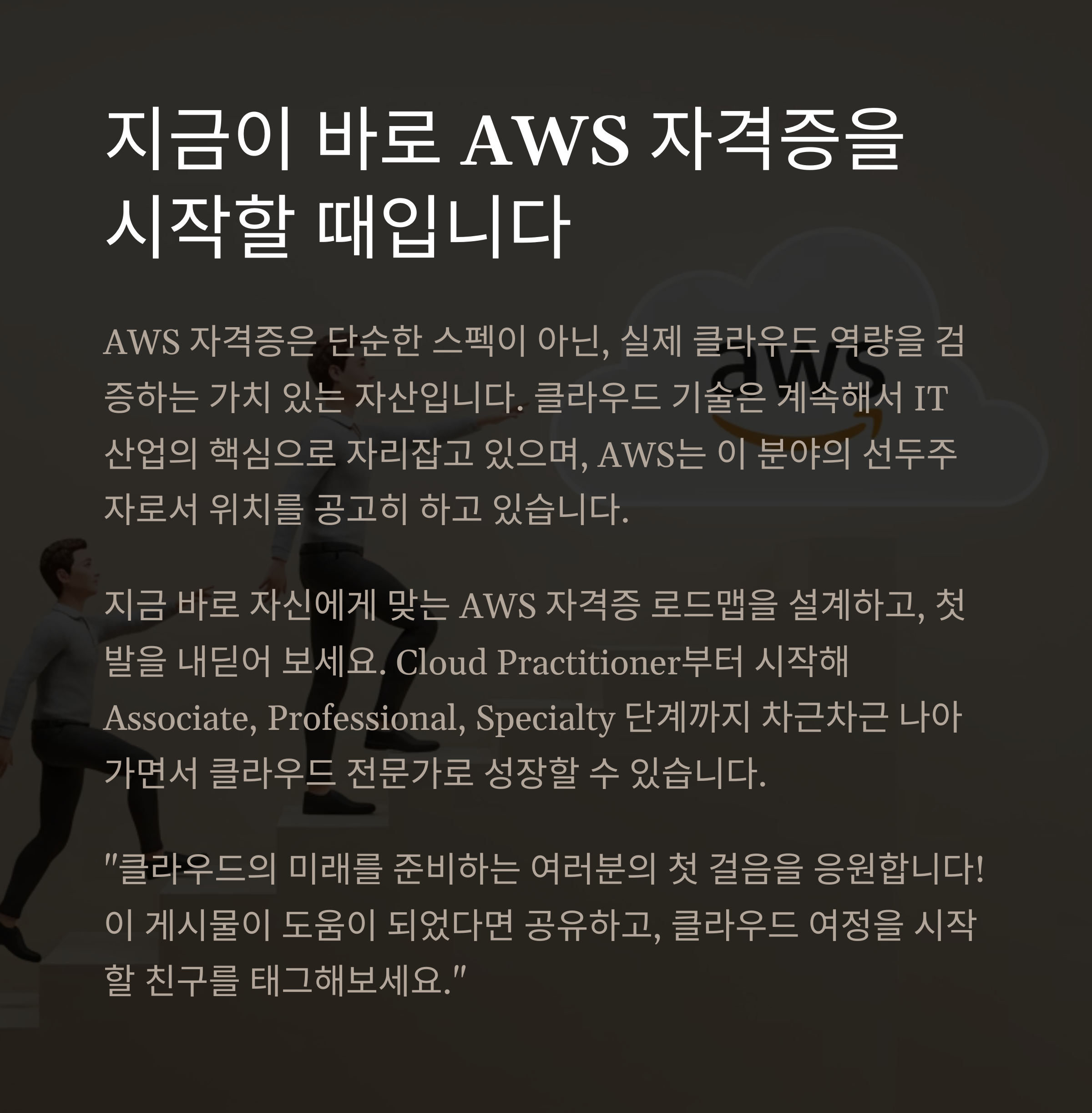 클라우드 시대에 뒤처지지 않고, 오히려 앞서나가는 IT 전문가가 되기 위한 여정을 지금 시작하세요. AWS 자격증은 그 여정의 든든한 이정표가 될 것입니다.