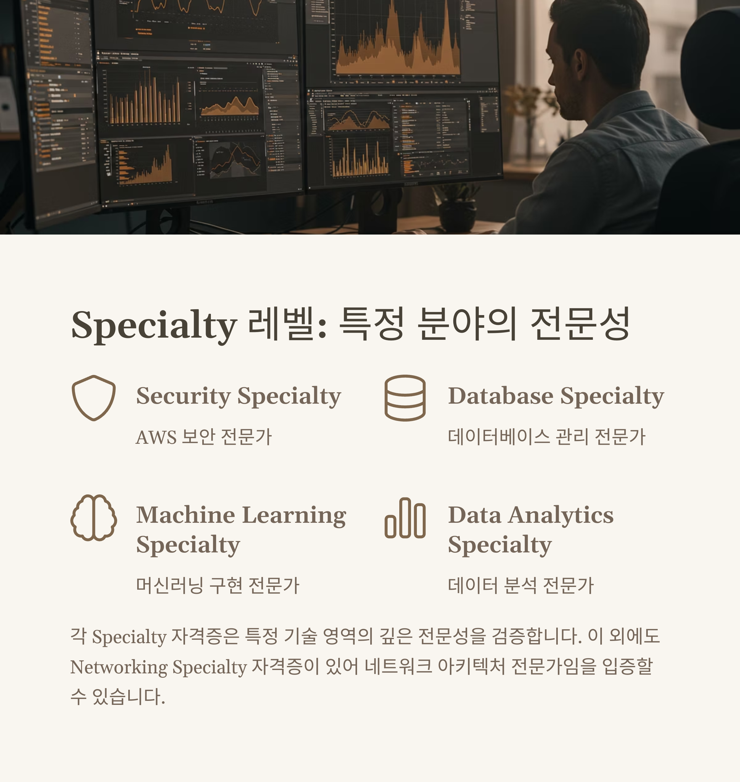 각 Specialty 자격증은 특정 기술 영역의 깊은 전문성을 검증합니다: