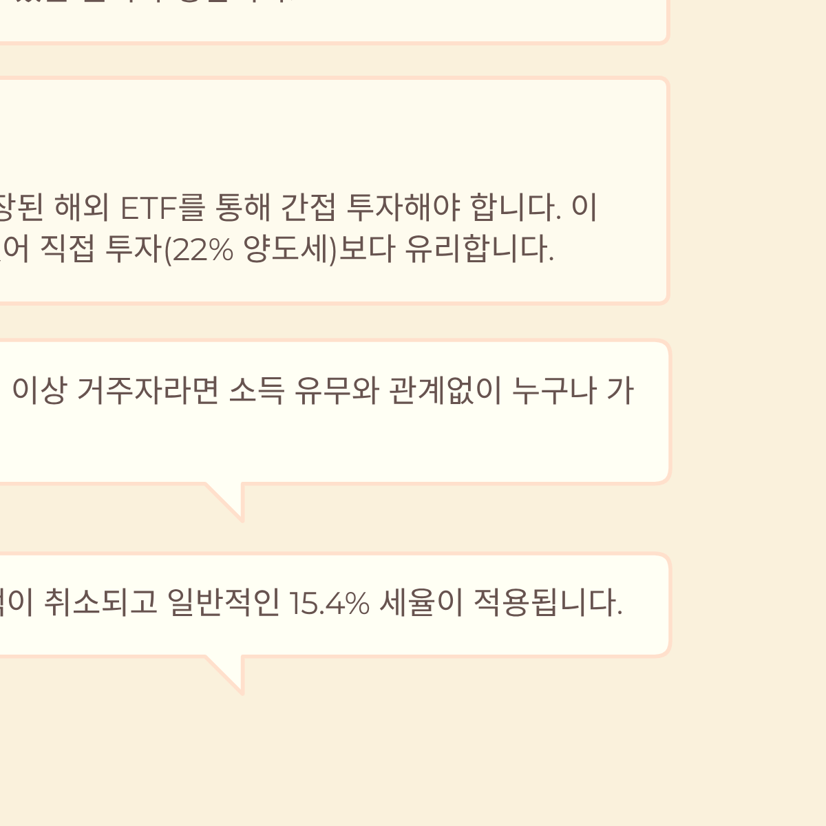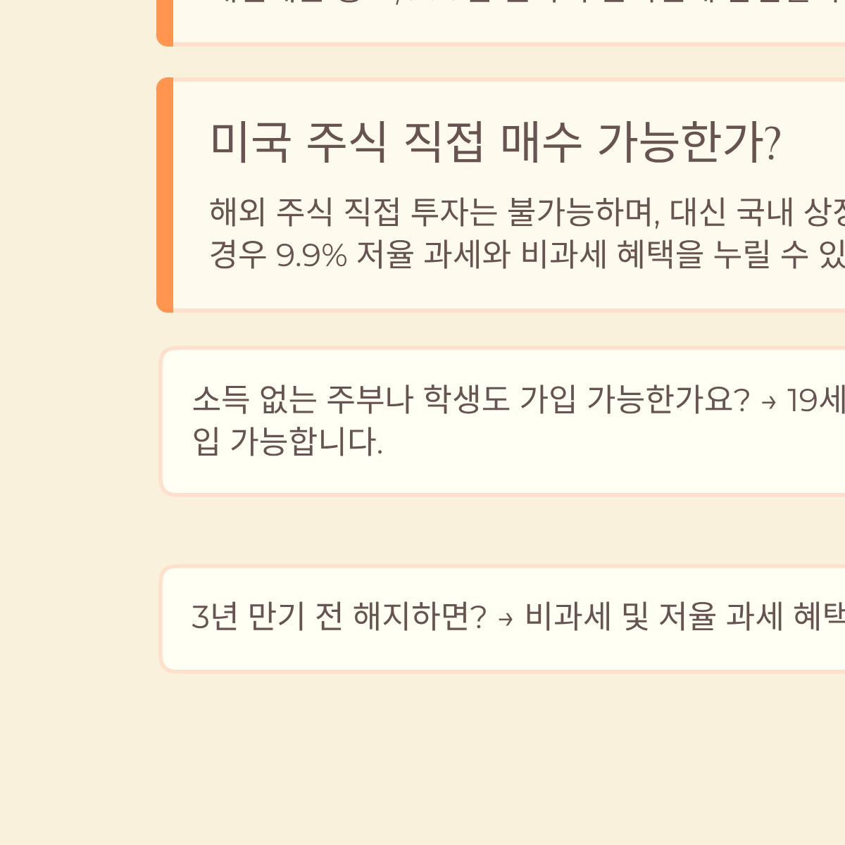 A: 해외 주식 직접 투자는 불가능하며, 대신 국내 상장된 해외 ETF(예: TIGER 미국나스닥100)를 통해 간접 투자해야 합니다. 이 경우 발생하는 수익에 대해 9.9% 저율 과세와 비과세 혜택을 누릴 수 있어 직접 투자(22% 양도세)보다 세금 면에서 훨씬 유리합니다.