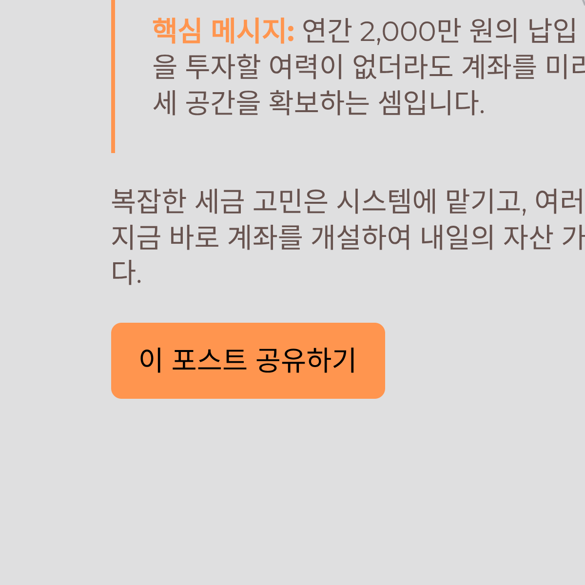 * 갑작스러운 목돈(상여금, 만기 적금 등)이 생겼을 때, 미리 개설한 계좌가 있어야만 한꺼번에 큰 금액을 절세 계좌에 넣을 수 있습니다.