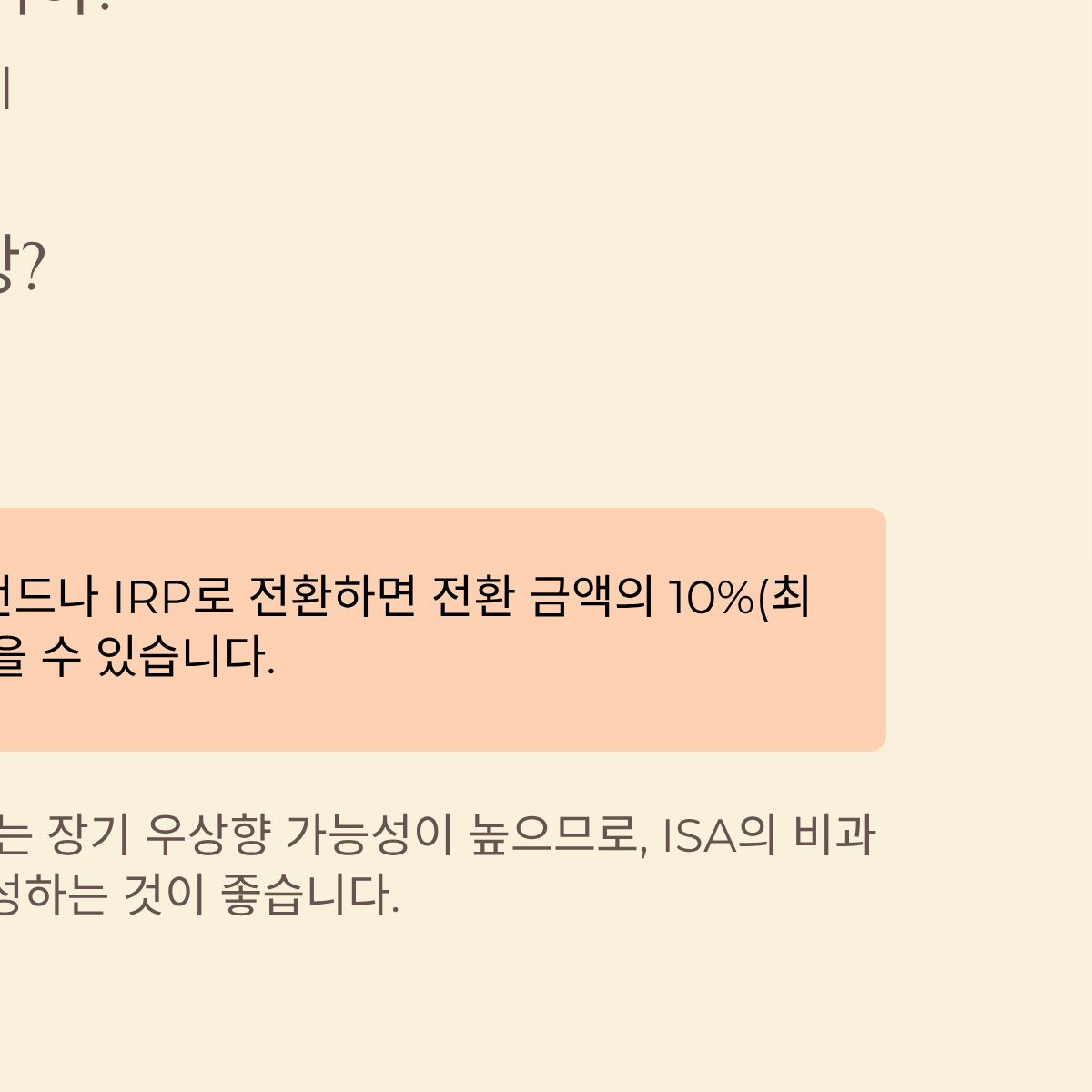 - 주목할 점: ISA 만기 자금을 연금저축펀드나 IRP(개인형 퇴직연금)로 전환하면 전환 금액의 10%(최대 300만 원)까지 추가 세액공제를 받을 수 있습니다.