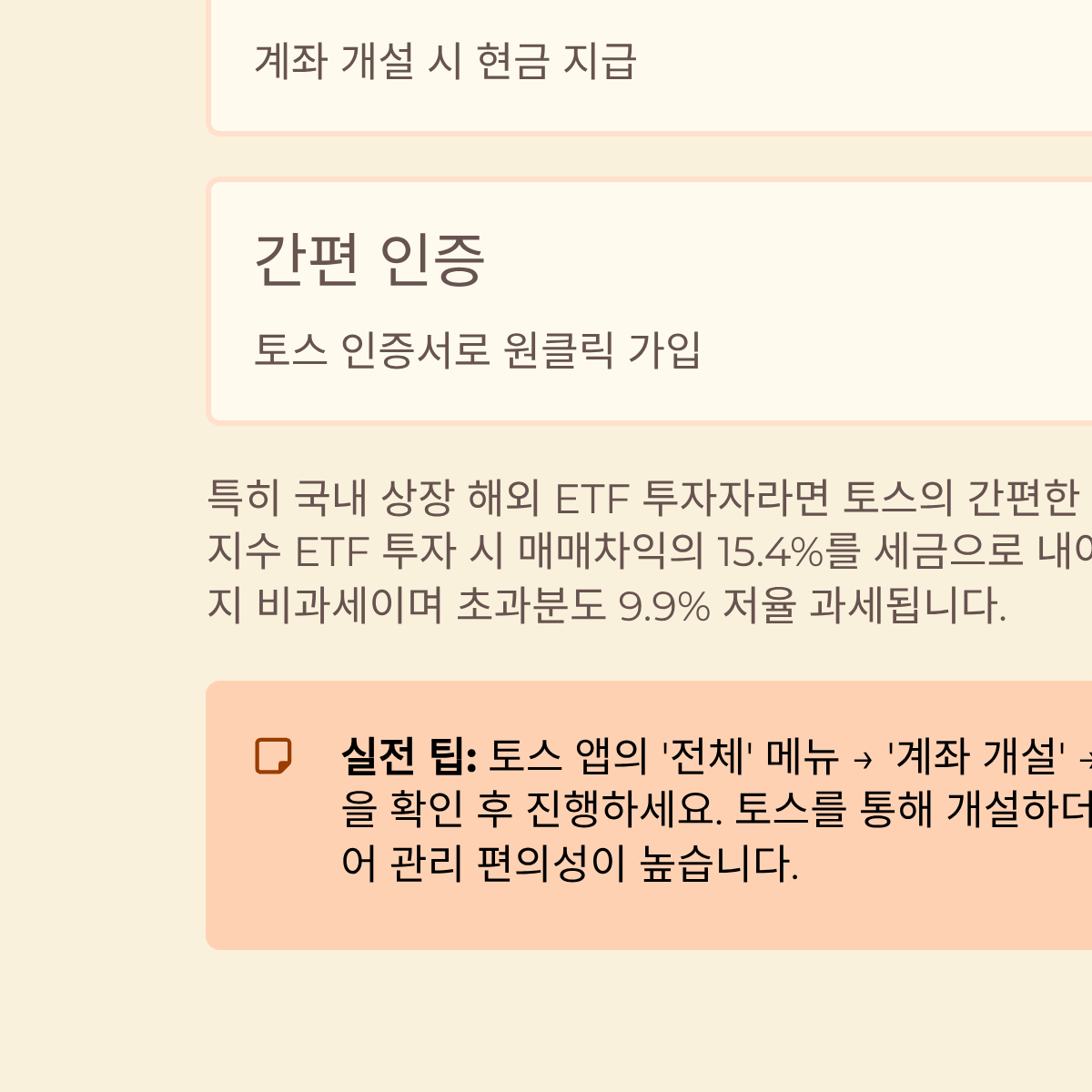 토스(Toss)는 복잡한 금융 절차를 극도로 단순화한 UI(User Interface)가 강점입니다. 많은 분이 토스증권 자체 ISA 상품을 찾으시는데, 정확히는 토스 앱 내에서 제휴 증권사(한국투자증권 등)의 계좌를 개설하는 방식입니다. 이 과정에서 토스만의 '현금 리워드'가 추가로 지급되어, 증권사 앱을 직접 설치하는 것보다 더 직관적이고 즉각적인 혜택을 체감할 수 있습니다. 특히 국내 상장 해외 ETF(Exchanged Traded Fund) 투자자라면 토스의 간편한 인터페이스가 큰 도움이 됩니다.