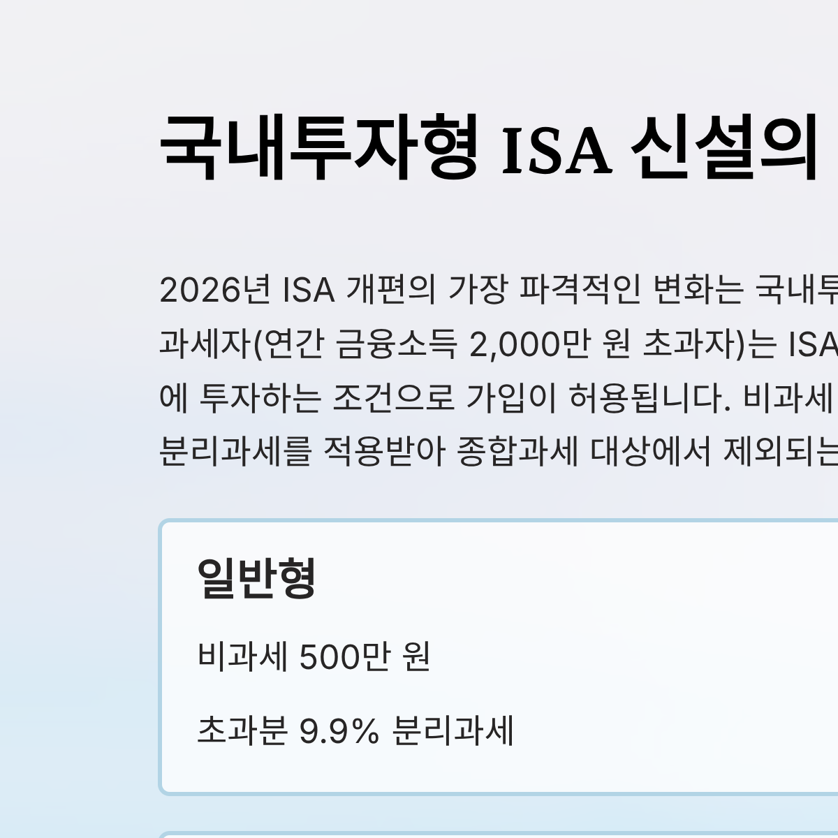 2026년 ISA 개편의 가장 파격적인 변화는 국내투자형 ISA의 신설입니다. 기존에는 금융소득종합과세자(Financial Income Comprehensive Tax, 연간 금융소득 2,000만 원 초과자)는 ISA 가입이 불가능했으나, 이제는 국내 주식과 채권에 투자하는 조건으로 가입이 허용됩니다. 비과세 혜택은 없지만, 15.4%의 배당소득세 대신 9.9% 분리과세를 적용받아 종합과세 대상에서 제외되는 엄청난 이점이 있습니다.