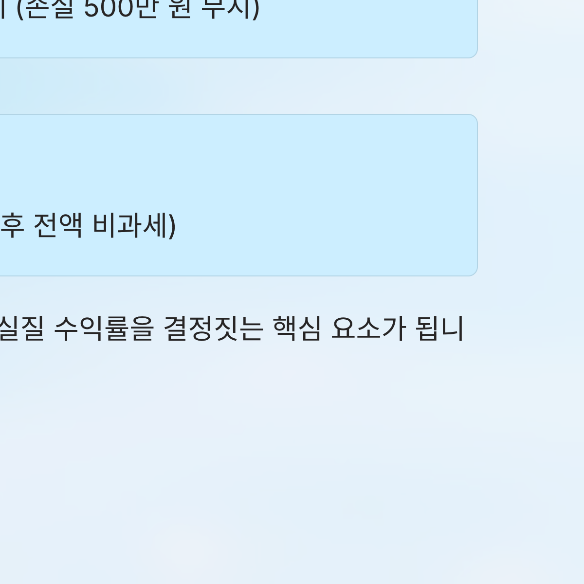 | 비과세 한도 | 500만 원 | 1,000만 원 | 없음 | 절세 규모 |