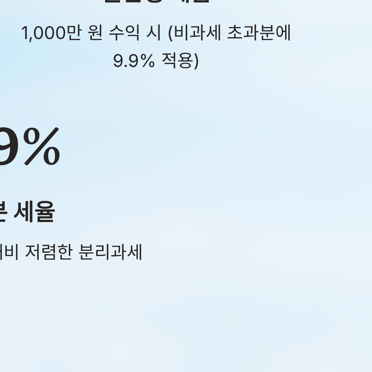 | 초과분 세율 | 9.9% 분리과세 | 9.9% 분리과세 | 9.9% 분리과세 | 종합과세 회피 |