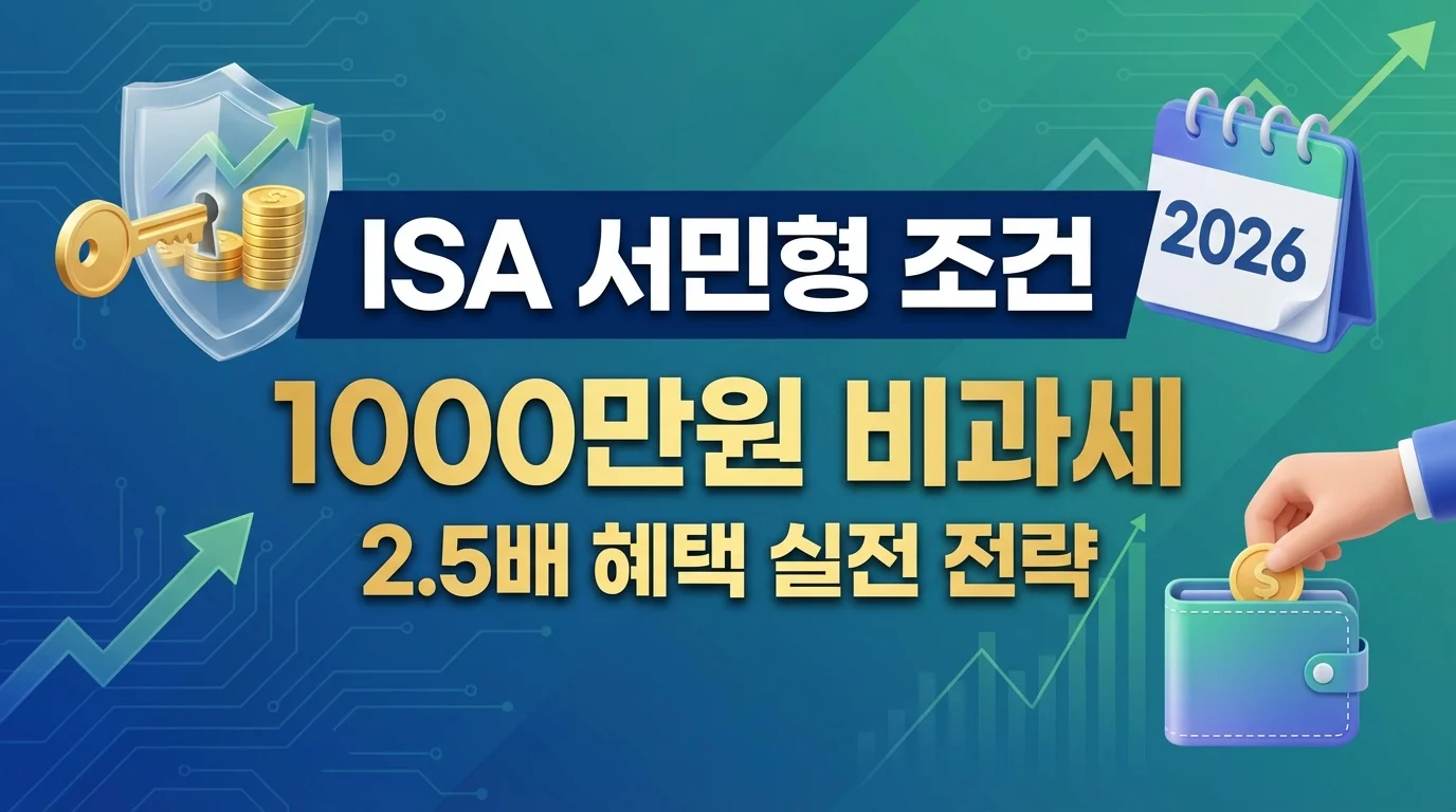 2026년 ISA 개편으로 서민형 비과세 한도가 1,000만 원까지 늘어났지만, 여전히 많은 분이 과거 기준에 머물러 혜택을 놓치고 있습니다. 이 글에서는 소득 요건에 따른 서민형 가입 및 전환 방법은 물론, 손익통산과 납입 한도 이월을 활용해 실질 수익률을 15.4% 이상 끌어올리는 차별화된 운용 전략을 모두 공개합니다.