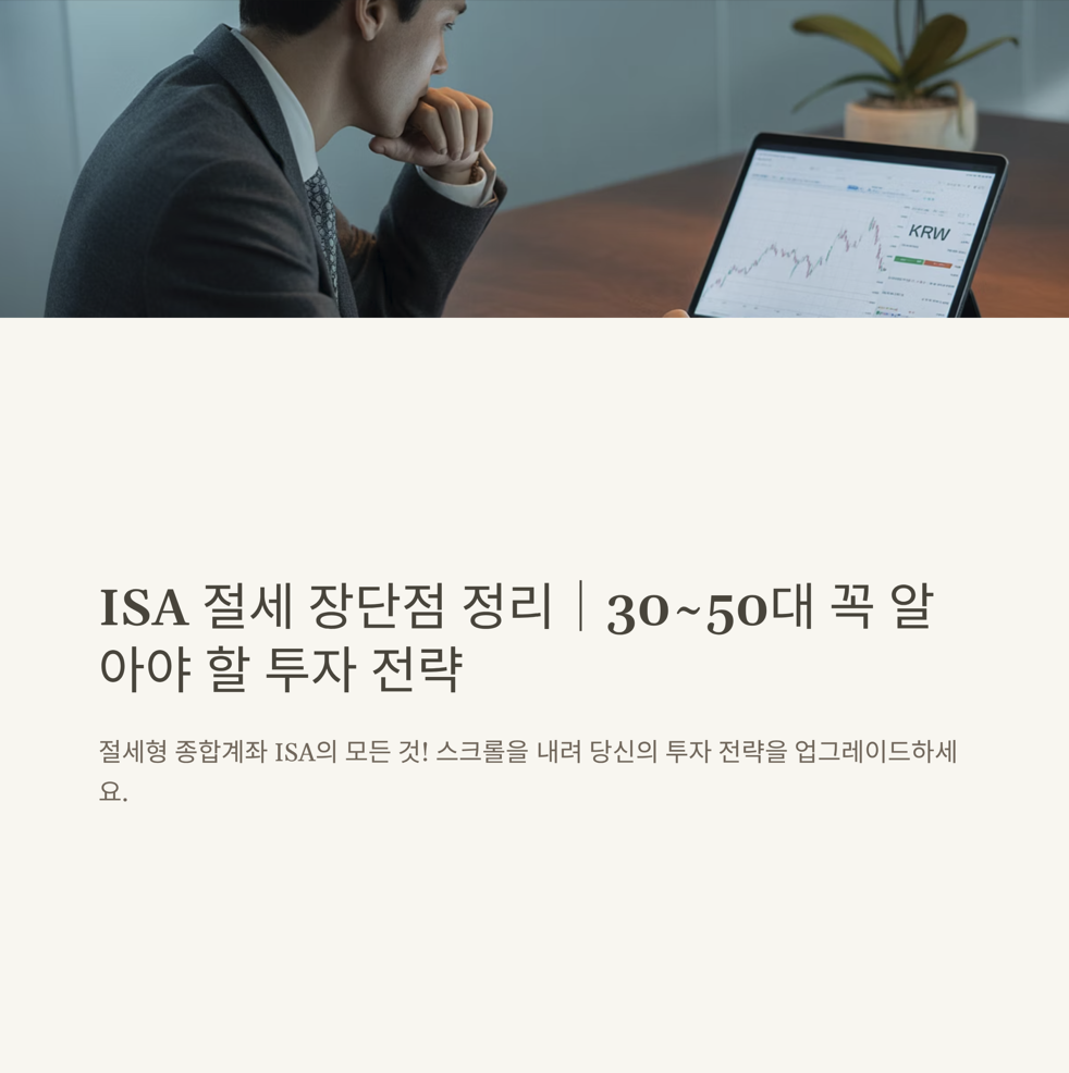 ISA는 단순히 절세만을 위한 수단이 아니라, 전체 자산 전략 안에서 중심축 역할을 할 수 있습니다.