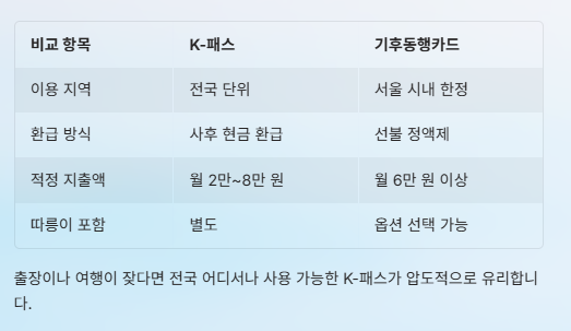 | 비교 항목 | K-패스 (환급형) | 기후동행카드 (정액형) | 핵심 인사이트 |