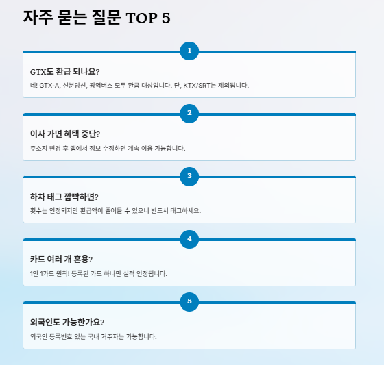 A: 네, GTX-A를 포함하여 신분당선, 광역버스 등 전국 모든 대중교통 이용 시 환급 혜택이 동일하게 적용됩니다. 다만, 별도 승차권을 구입해야 하는 KTX나 SRT는 환급 대상에서 제외되니 주의하시기 바랍니다.