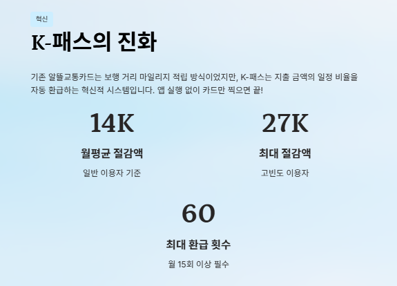 * 국토교통부 대도시권광역교통위원회(K-패스 운영 주체)의 2024년 상반기 통계에 따르면, 이용자 1인당 월평균 15,074원을 절감하고 있으며 이는 지출액의 약 20~50% 수준입니다.