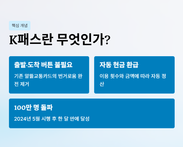 K패스(K-Pass)는 기존 알뜰교통카드의 번거로웠던 '출발·도착 버튼 누르기'를 완전히 삭제하고, 오직 대중교통 이용 횟수와 금액에 따라 정해진 비율만큼 현금으로 돌려주는 혁신적인 교통 복지 시스템입니다. 제가 직접 현장에서 많은 이용자를 상담해보니, 가장 많이 하시는 실수가 "카드만 발급받으면 끝"이라고 생각하시는 점입니다. K패스는 카드 발급 후 반드시 공식 홈페이지나 앱에서 회원가입 및 카드 번호 등록을 마쳐야만 환급이 시작됩니다. 2024년 5월 시행 이후 국토교통부 대도시권광역교통위원회(대광위)의 발표에 따르면, 도입 한 달 만에 가입자 100만 명을 돌파할 정도로 폭발적인 반응을 얻고 있습니다. 이는 단순한 할인을 넘어, 고물가 시대에 실질적인 '제2의 월급' 역할을 하기 때문입니다.