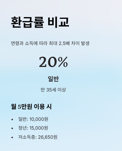 - 일반 K패스 적용 시: 20,000원 환급 (일반인 기준)