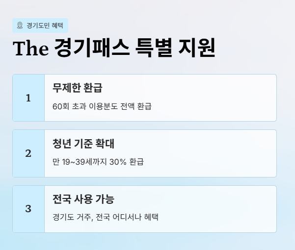 | 환급 횟수 제한 | 월 60회 | 무제한 (The 경기패스 연계 시) | 60회 초과 이용분도 환급 |