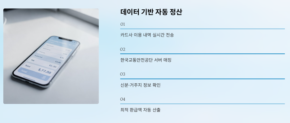 K패스 모두의카드가 가진 가장 큰 기술적 강점은 이용자가 매번 계산기를 두드릴 필요가 없는 '데이터 기반 자동 정산 시스템'에 있습니다. 과거 알뜰교통카드는 이용자가 직접 앱을 켜서 GPS를 작동시켜야 했기에 데이터 누락이나 오작동으로 인한 민원이 많았습니다. 하지만 현재의 시스템은 카드사로부터 수집된 대중교통 이용 내역(Transaction Data)이 실시간으로 한국교통안전공단의 K패스 서버로 전송되고, 여기서 가입자의 신분(청년, 저소득층 등)과 거주지(경기도, 인천시 등) 정보를 매칭하여 최적의 환급액을 자동 산출합니다.