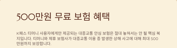 | 무료 상해 보험 | 대중교통 사고 시 최대 500만 원 보장 | 안전 보장 및 심리적 안심 |