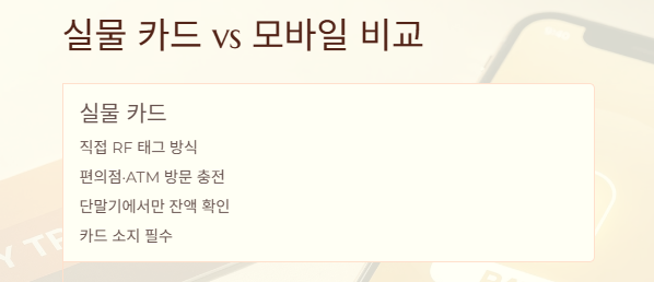 이 표를 통해 실물 카드와 모바일티머니의 실질적인 사용 편의성 차이를 한눈에 확인할 수 있습니다.