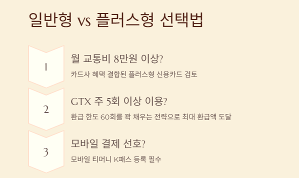 일반형과 플러스형(또는 카드사별 추가 혜택 결합형)을 선택할 때는 본인의 월평균 교통비 지출액을 먼저 파악해야 합니다. 통계청의 2024년 가계동향조사에 따르면 수도권 거주 직장인의 평균 교통비 지출은 전년 대비 8.2% 상승했습니다. 이러한 상황에서 GTX 이용자는 환급률뿐만 아니라 '카드사 추가 할인'이 중복 적용되는지 확인해야 합니다. K패스 자체 환급(최대 60회 한도)에 카드사의 대중교통 10% 추가 할인이 더해지면, 실제 체감하는 교통비 부담은 절반 가까이 줄어들 수 있습니다.