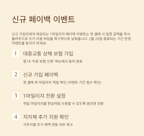 대부분의 사용자가 환급 혜택에만 집중하지만, K패스 티머니 사용자에게만 제공되는 '대중교통 안심 보험'은 절대 놓쳐서는 안 될 핵심 복지입니다. 티머니와 제휴 보험사가 제공하는 이 서비스는 대중교통 이용 중 발생한 상해 사고에 대해 최대 500만 원까지 보장하며, 별도의 가입 비용 없이 앱 내 동의만으로 효력이 발생합니다. 제가 상담했던 사례 중에서도 이 혜택을 몰라 청구하지 못한 안타까운 경우가 많았습니다. 또한, 신규 가입자에게 제공되는 'T마일리지 페이백' 이벤트는 첫 결제 시 일정 금액을 즉시 돌려주므로 초기 이용 부담을 획기적으로 낮춰줍니다.