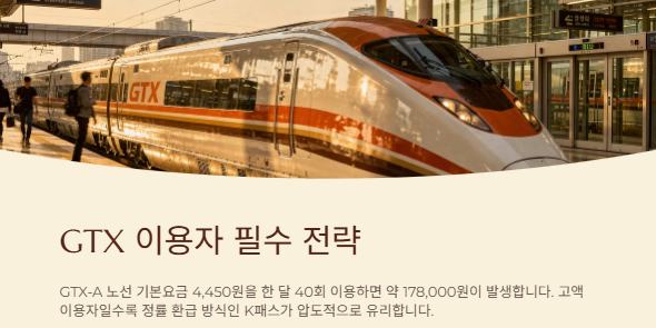 수도권 출퇴근의 핵심인 GTX(Great Train eXpress, 수도권 광역급행철도)와 광역버스는 일반 시내버스보다 기본 운임이 월등히 높습니다. 예를 들어 GTX-A 노선의 경우 기본요금이 4,450원에 달하는데, 이를 한 달 40회 이용할 경우 약 178,000원의 비용이 발생합니다. 이때 K패스 티머니의 진가가 발휘됩니다. 일반적인 신용카드 할인은 월 한도가 1~2만 원 내외로 제한적이지만, K패스는 이용 금액의 일정 비율을 환급해주기 때문에 고액 이용자일수록 유리한 구조입니다.