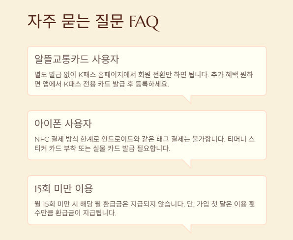 A: 기존 알뜰교통카드 사용자는 별도 발급 없이 K패스 홈페이지에서 회원 전환만 하면 그대로 혜택을 받을 수 있습니다. 다만, 모바일티머니만의 추가 페이백이나 보험 혜택을 원하신다면 앱 내에서 K패스 전용 카드를 새로 발급받아 등록해야 합니다.