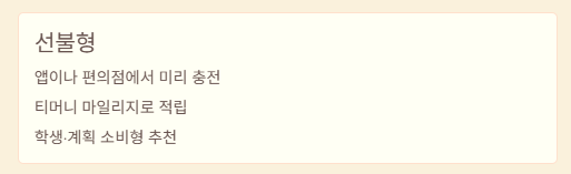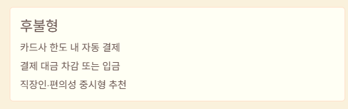 | 이용 편의성 | 잔액 관리 필요 | 잔액 신경 쓸 필요 없음 | 관리 편의성 |