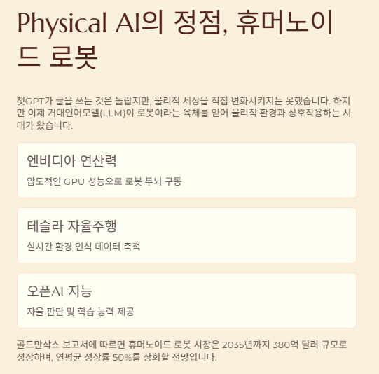이 표를 보면 알 수 있는 핵심 인사이트는, 피지컬 AI가 단순한 지능을 넘어 '실행력'을 갖춘 완전체로 진화하고 있다는 점입니다.