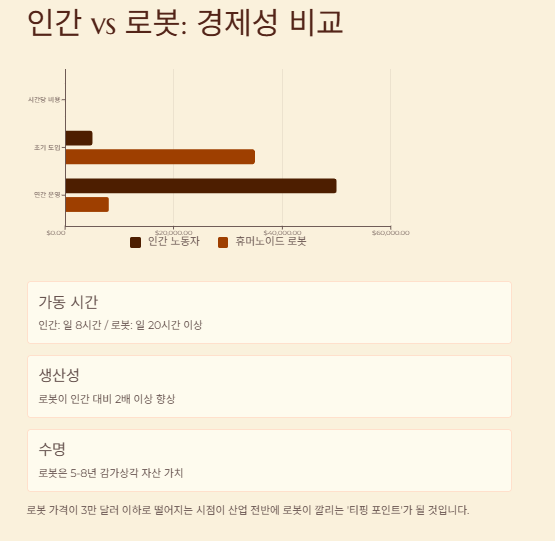 이 표는 인간 노동력과 휴머노이드 로봇의 경제성을 비교하여 투자 가치를 직관적으로 보여줍니다.