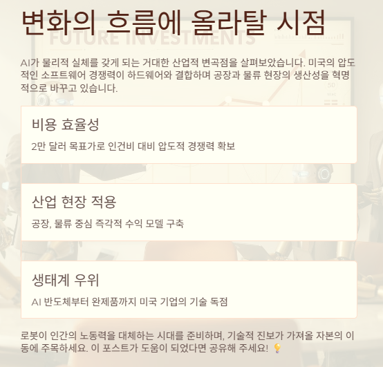 * 투자 시 단순 로봇 조립 기업보다 '두뇌(AI)'와 '신경망(통신/제어)' 기술을 보유한 미국 기업에 집중해야 합니다.