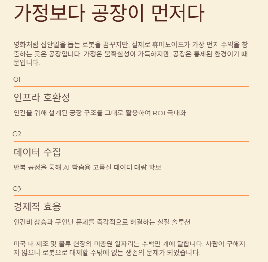 A: 휴머노이드 시장의 초기 성장은 가정이 아닌 노동력 부족이 심각한 '공장'과 '물류 창고'에서 먼저 발생하며, 이는 이미 확정된 수익 모델입니다. 가사 로봇은 향후 추가적인 보너스 시장일 뿐이며, 현재는 산업 현장의 '피지컬 AI' 전환만으로도 충분한 투자 명분을 갖습니다.