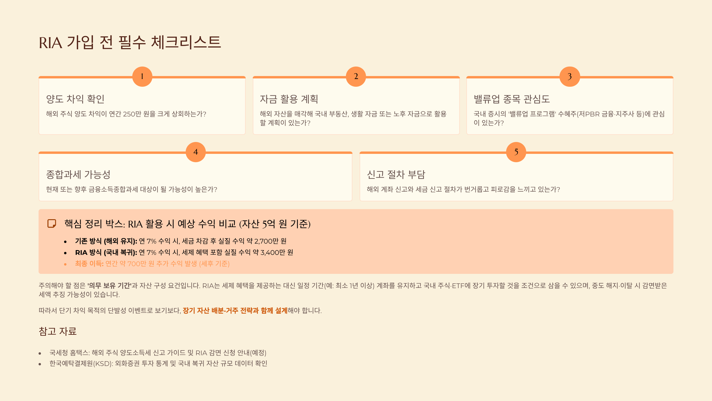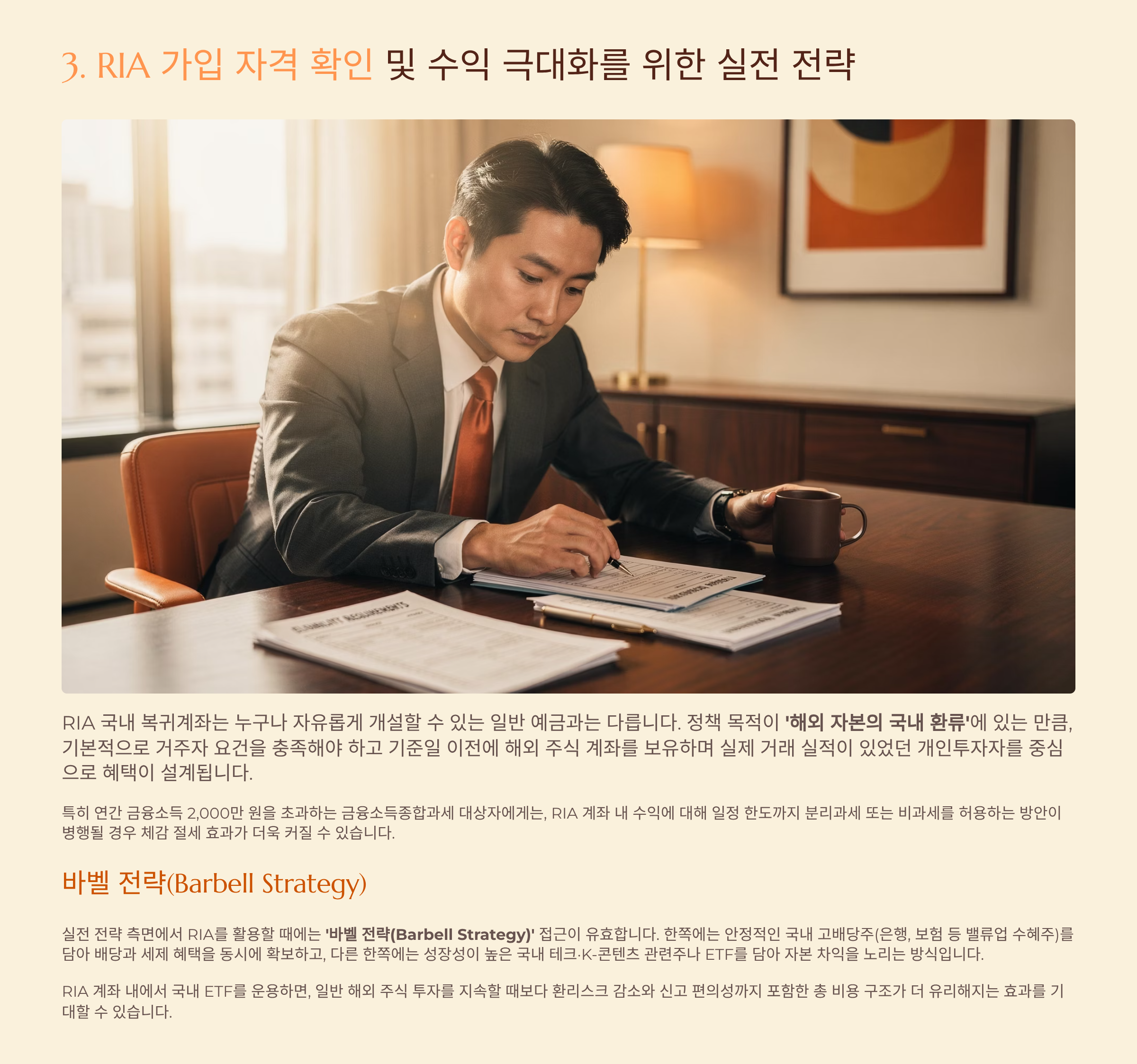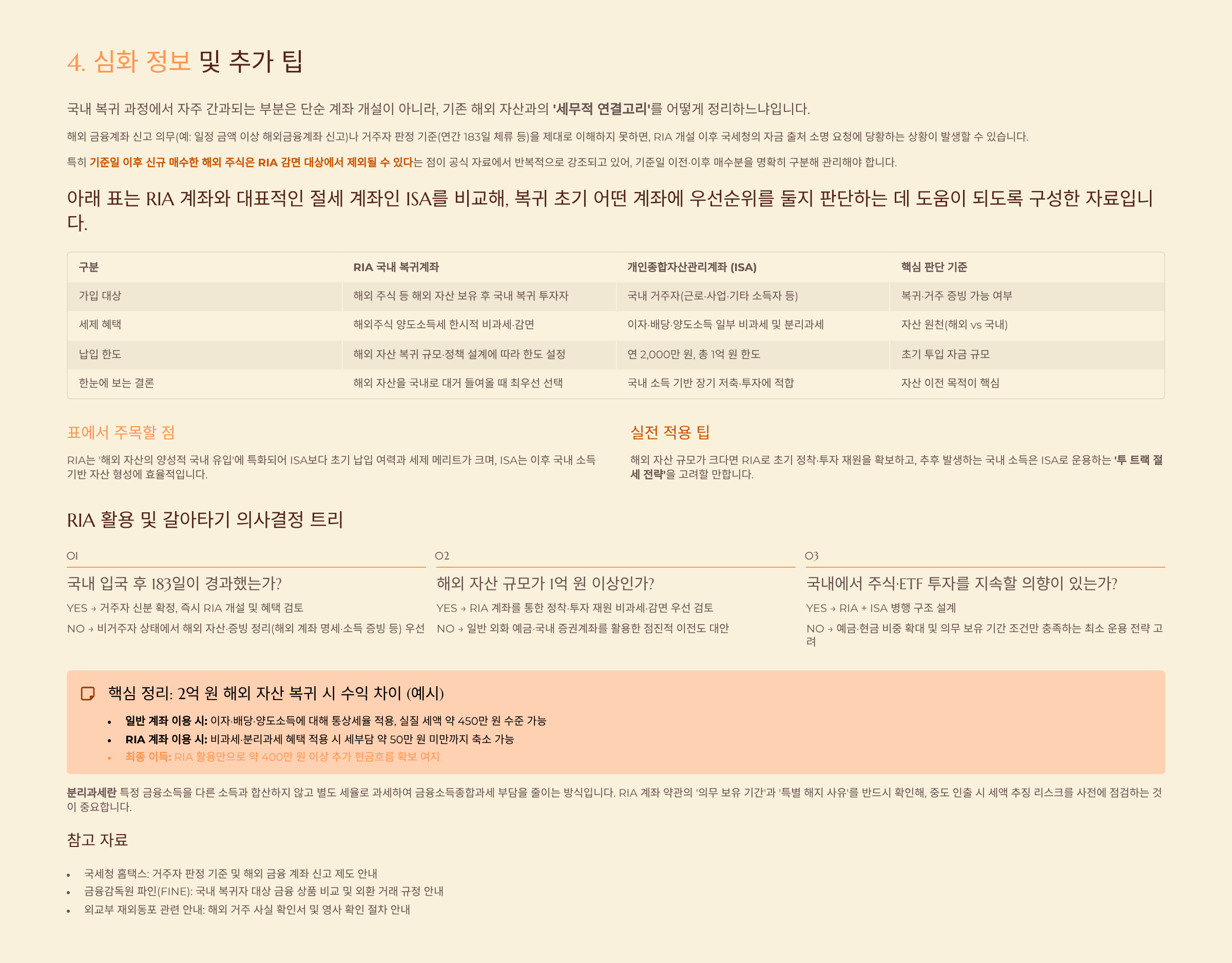 - 실전 적용 팁: 해외 자산 규모가 크다면 RIA로 초기 정착·투자 재원을 확보하고, 추후 발생하는 국내 소득은 ISA로 운용하는 '투 트랙 절세 전략'을 고려할 만합니다.