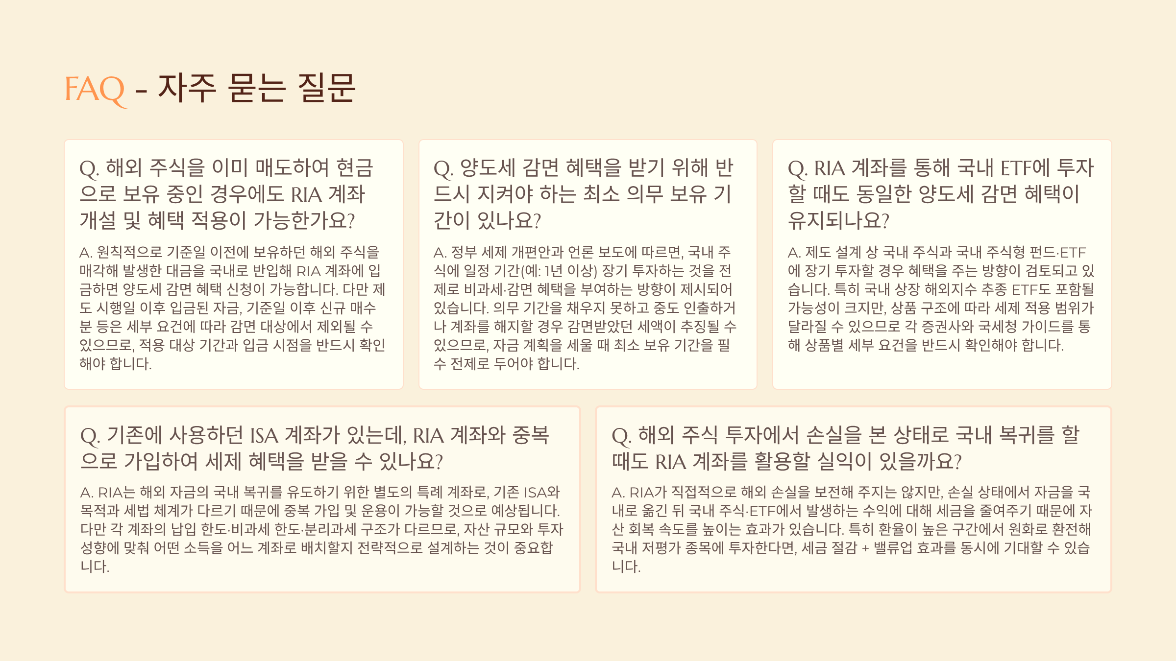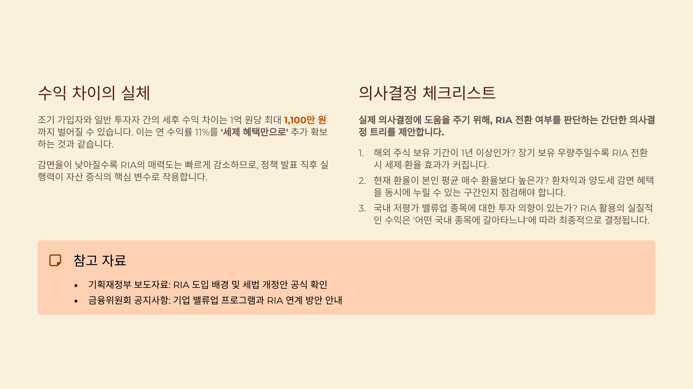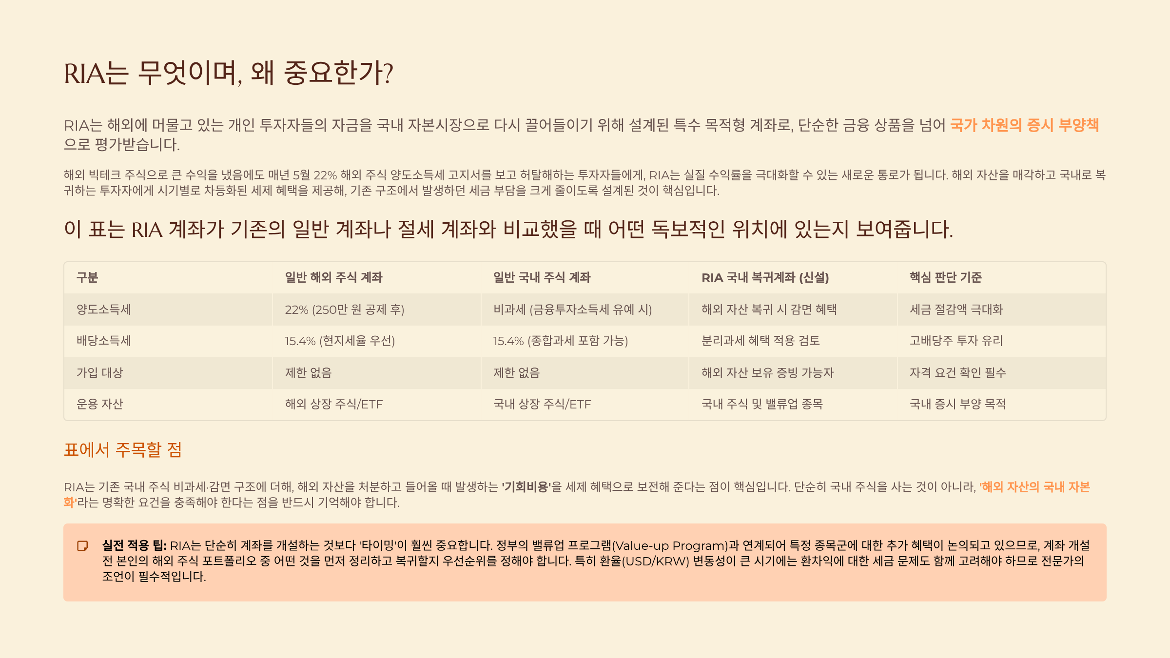 - RIA는 기존 국내 주식 비과세·감면 구조에 더해, 해외 자산을 처분하고 들어올 때 발생하는 '기회비용'을 세제 혜택으로 보전해 준다는 점이 핵심입니다.