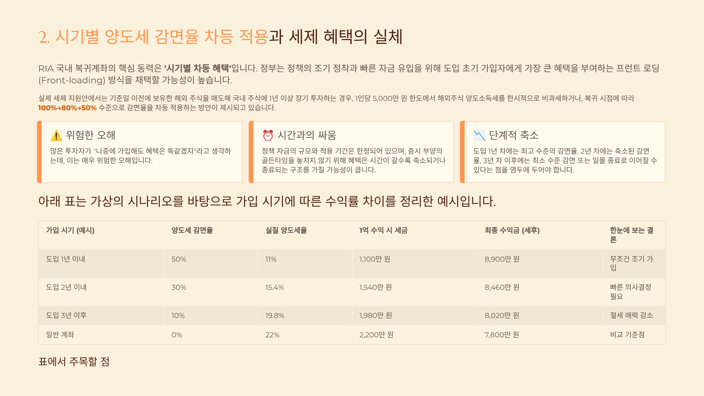 - 감면율이 낮아질수록 RIA의 매력도는 빠르게 감소하므로, 정책 발표 직후 실행력이 자산 증식의 핵심 변수로 작용합니다.