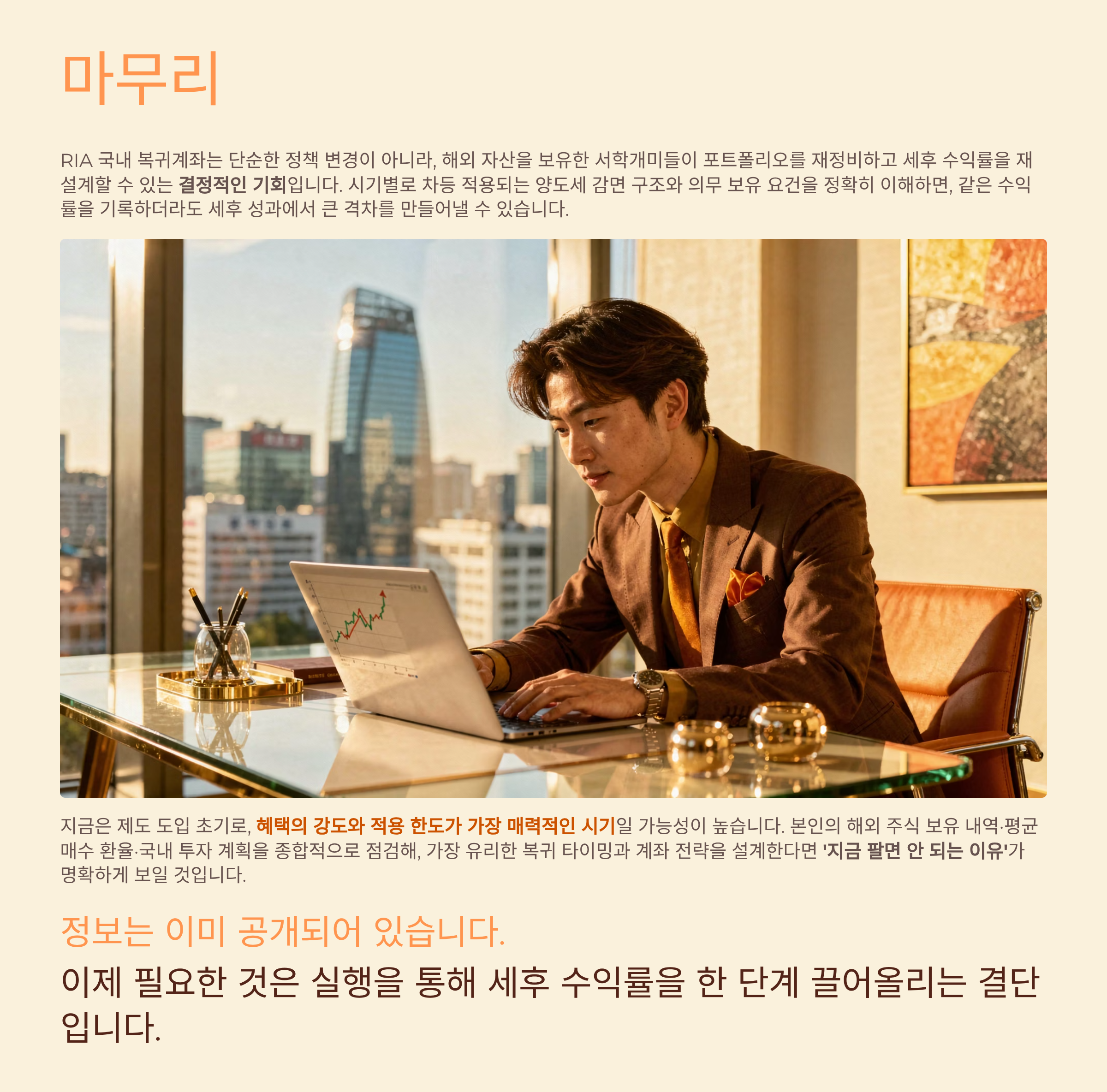 RIA 국내 복귀계좌는 단순한 정책 변경이 아니라, 해외 자산을 보유한 서학개미들이 포트폴리오를 재정비하고 세후 수익률을 재설계할 수 있는 결정적인 기회입니다. 시기별로 차등 적용되는 양도세 감면 구조와 의무 보유 요건을 정확히 이해하면, 같은 수익률을 기록하더라도 세후 성과에서 큰 격차를 만들어낼 수 있습니다.