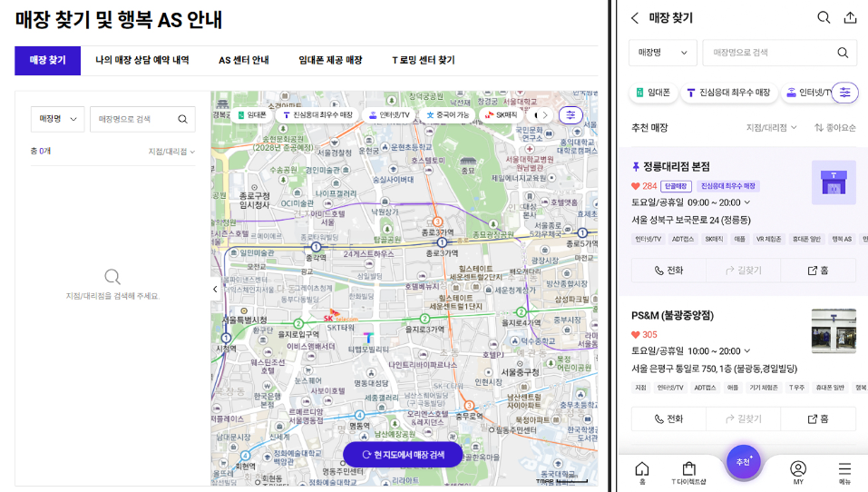 SKT 공식 홈페이지나 T월드 앱에서 ‘매장찾기’ 기능을 이용하면 집이나 회사 근처의 공식 대리점/직영점을 쉽게 찾을 수 있습니다.