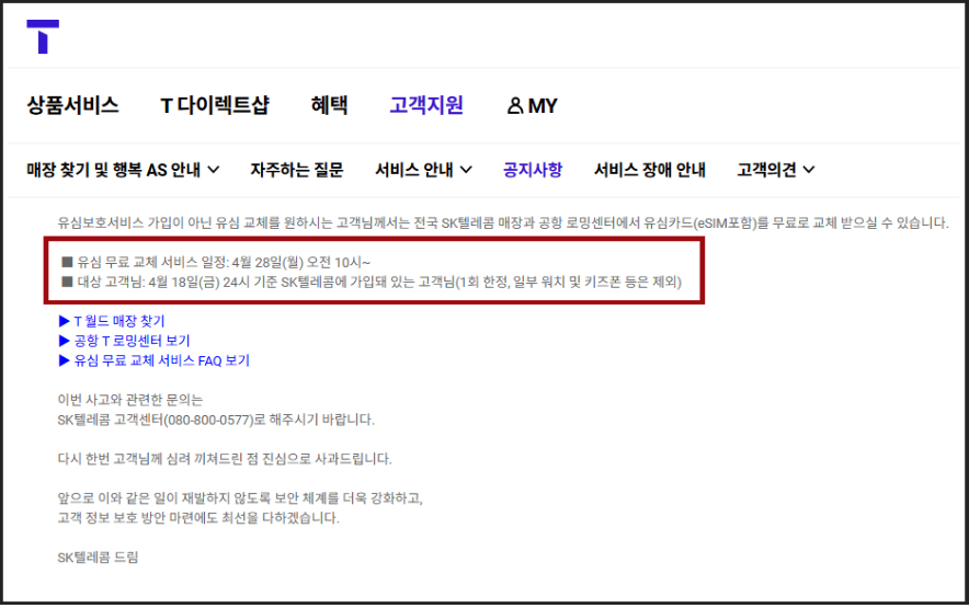 - 대리점 위치 확인: 가까운 SKT 공식 대리점이나 직영점을 미리 검색해 방문하세요. 일부 판매점에서는 무상 교체가 어려울 수 있습니다.