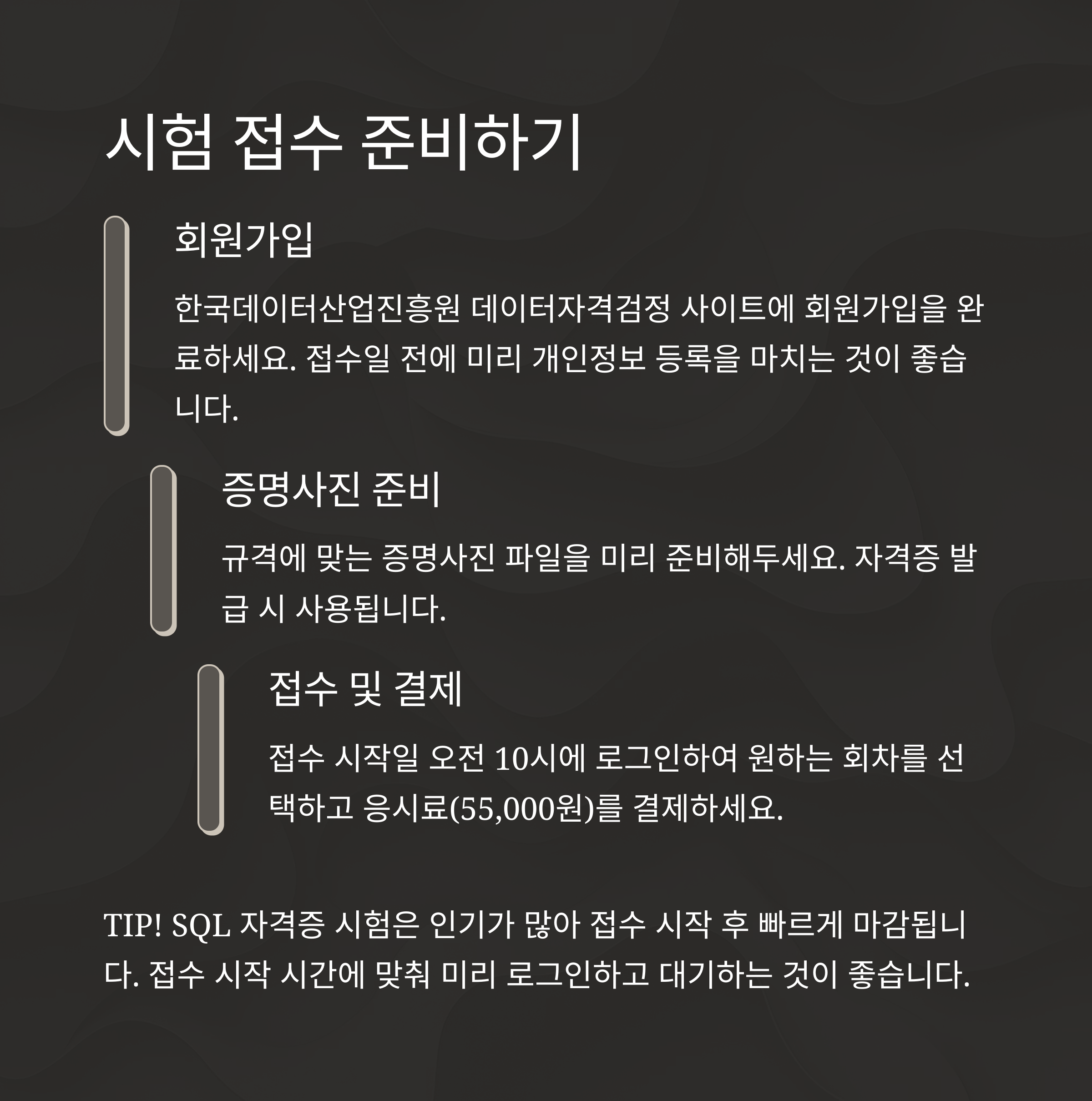 SQL 자격증 시험 접수는 한국데이터산업진흥원 공식 홈페이지를 통해 진행됩니다. 다음은 접수부터 합격까지의 전체 과정입니다.